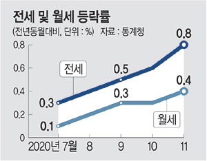 올해 11월 소비자물가 상승률이 0%대를 기록했다. 그러나 전세와 월세 상승률은 고공행진을 이어갔다.