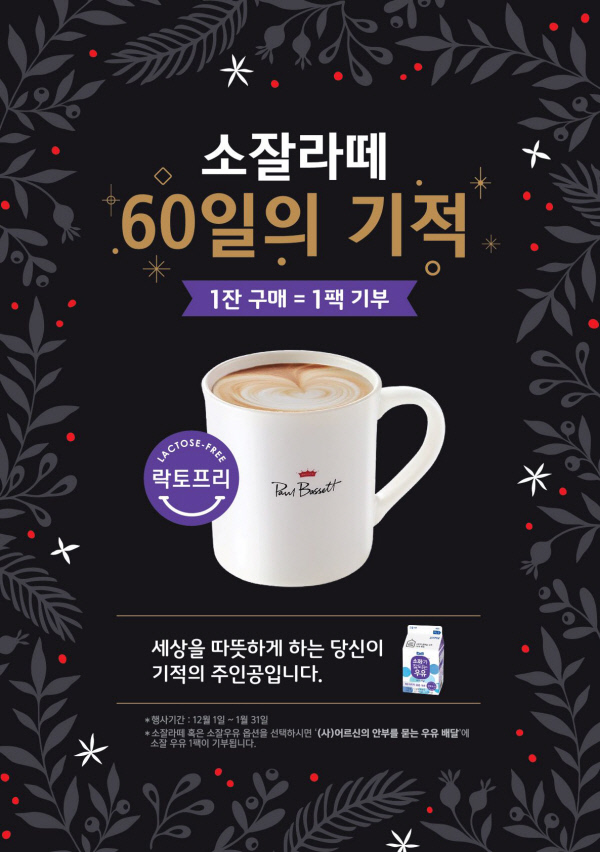 매일유업은 연말연시를 맞아 폴 바셋에서 ‘소화가 잘되는 우유’(소잘우유)로 만든 카페라떼를 마시면 소잘우유 180ml 제품 1팩이 기부되는 ‘소잘라떼 60일의 기적’ 캠페인을 진행한다고 2일 밝혔다.