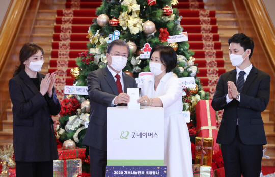 문재인 대통령과 김정숙(왼쪽 세 번째) 여사가 4일 오전 청와대 본관에서 열린 ‘2020 기부 나눔단체 초청행사’에 참석, 굿네이버스 모금함에 성금을 넣고 있다.