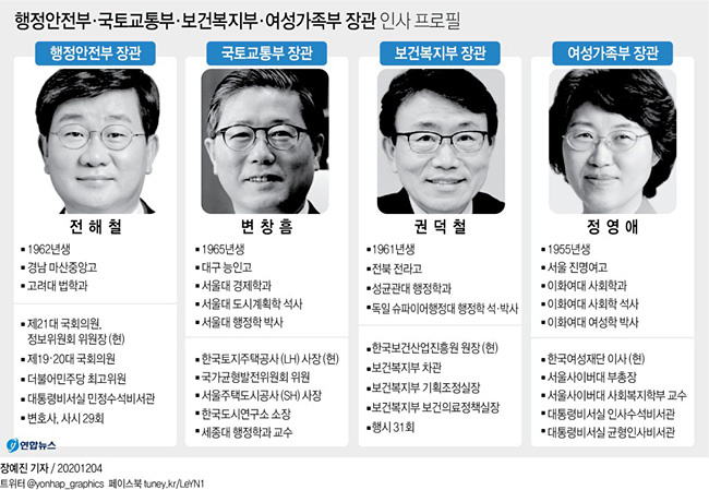 문 대통령은 이날 국토부 장관에 변창흠 한국토지주택공사(LH) 사장, 행정안전부 장관에 전해철 더불어민주당 의원, 보건복지부 장관에 권덕철 한국보건산업진흥원 원장, 여성가족부 장관에 정영애 한국여성재단 이사를 각각 내정했다고 정만호 청와대 국민소통수석이 발표했다.