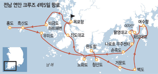 전남도는 최근 최종보고를 받은 ‘전남 연안크루즈 도입 타당성 조사 연구용역’ 결과를 토대로 5000t급 선박을 활용, 도내 섬들을 돌아보는 연안크루즈 사업을 추진하기로 했다고 7일 밝혔다. 이를 위해 목포·완도·여수권 등 3개 권역에 모항지 4곳(목포·여수·완도항, 여수웅천원형마리나)과 기항지 14곳을 선정했다. 우선 시행 가능한 항로는 목포항을 모항지로 하고 신안군 비금도·흑산도·우이도와 여수시 거문도·금오도·손죽도, 완도군 청산도·노화도·보길도를 차례로 거쳐 목포항으로 돌아오는 4박 5일 코스다.