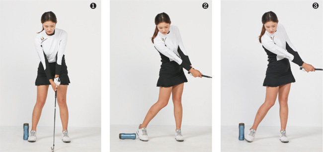 방법은 아주 간단하다. 사진①처럼 평소 자신의 어드레스를 취한다. 어떤 클럽이든 상관없다. 그런 다음 오른발 바깥쪽(정확히는 오른발 바깥쪽 뒤꿈치)에 물병 또는 텀블러, 캔 음료 등 물체를 세워 놓고 샷을 한다.