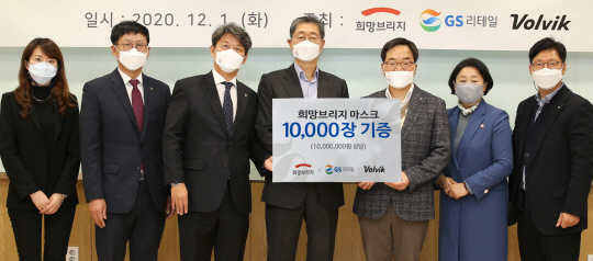 GS리테일은 7일 민간구호단체인 ‘희망브리지’, 골프브랜드인 ‘볼빅’과 함께 취약계층을 위한 KF94 보건용 마스크 기부활동 및 판매에 나선다고 밝혔다. 지난 1일 서울 마포구 신수동 희망브리지 본관에서 김종수(사진 오른쪽 세 번째) GS리테일 MD 본부장, 송필호(〃 네 번째) 희망브리지 회장, 윤성용(〃 다섯 번째) 볼빅 전무 등이 제휴 협약식을 하고 있다.