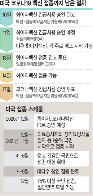 하지만 바로 접종이 시작되지는 않는다. CDC가 백신 접종에 대한 결정을 내려야 한다. CDC의 예방접종자문위원회(AICP)는 11일과 13일 회의를 열고 13일 투표를 통해 접종해도 될지 결정한다. CDC의 권고 결정이 나면 이르면 오는 14일부터 실제 접종이 이뤄질 수 있다. 앨릭스 에이자 미 보건복지부 장관은 “앞으로 몇 주 내에 2000만 명이 백신을 접종할 것이고 내년 1~3월에 걸쳐 백신이 생산라인에서 나오는 대로 계속해서 내놓을 것”이라고 말했다. 그는 또 “2021년 2분기 말까지는 백신을 원하는 모든 미국인이 이를 접종할 수 있다고 확신한다”고 밝혔다.
