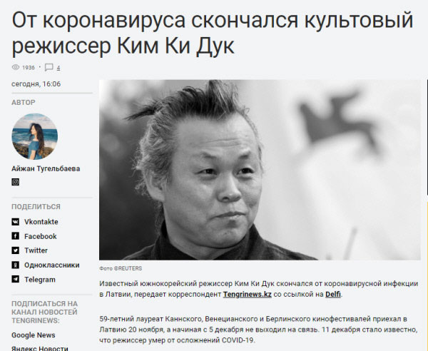 카자흐스탄 텡그리뉴스(Tengrinews)는 11일 “라트비아에 있던 김 감독은 5일부터 아무런 연락을 받지 않았고 11일 신종 코로나바이러스 감염증(코로나19)에 의한 합병증으로 사망했다”고 보도했다.
