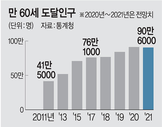 14일 은행권에 따르면, 시중은행들은 노년층(시니어) 고객을 대상으로 한 서비스를 확대하는 데 나서고 있다. 통계청에 따르면 2011년 40만 명대에 불과했던 만 60세 도달인구는 2019년 84만2000명으로 늘었고, 올해와 내년에는 연간 90만 명 이상으로 확대될 전망이다.