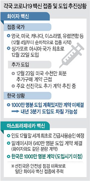 정부가 내년 2∼3월 공급을 비교적 자신하는 아스트라제네카 백신은 임상 결과에 문제가 있어 선진국들은 접종하지 않고 있다. 인도가 다음 주 사용을 승인할 예정이지만 미국과 캐나다 등에서는 사용 승인이 나지 않은 상태다. 주로 화이자 백신을 확보하지 못한 아시아 국가들이 대안으로 아스트라제네카와 백신 도입 계약을 체결하고 있는 상태다.