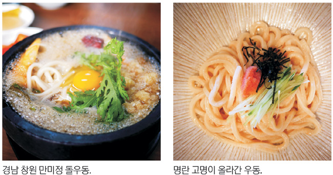 ◇창원 만미정 = 경남 창원시 마산 구도심에서 돌우동으로 오랜 시간 인기를 끌어온 노포. 돌우동과 메밀국수로 유명하다. 얼핏 보면 허름한 분식점 분위기지만 노포의 기품이 서려 있다. 보글보글 끓는 돌우동은 시원한 국물에 쫄깃한 면, 그리고 쫀득한 어묵에 대추, 맛살, 밤이 든 고급 우동이다. 달걀을 풀어 고소한 맛을 내는 국물을 비우고 나면 겨울이 두렵지 않다. 플라스틱판에 내오는 메밀국수 역시 진한 육수 맛이 일품이다. 경남 창원시 마산합포구 불종거리로 27-1. 8000원.
