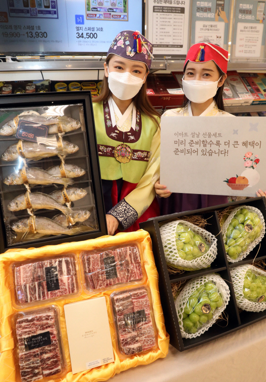 4일 이마트 서울 성수점에서 모델들이 설 선물세트를 선보이고 있다. 이마트는 명절 선물 트렌드 변화에 따라 한우 갈비 세트 대신 구이용 상품과 과일 선물세트 비중을 늘렸다고 밝혔다.