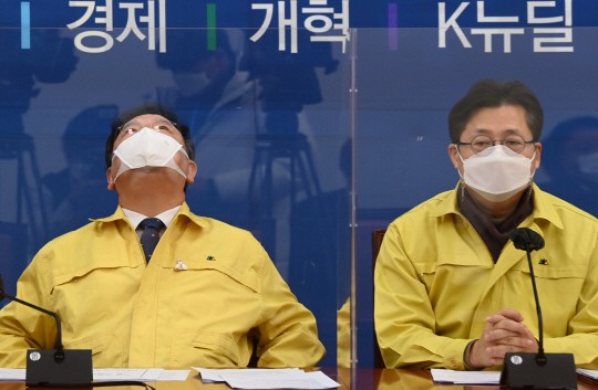 김태년(왼쪽) 더불어민주당 원내대표가 12일 오전 국회에서 열린 원내대책회의에서 천장을 바라보며 홍익표 정책위의장의 발언을 듣고 있다.