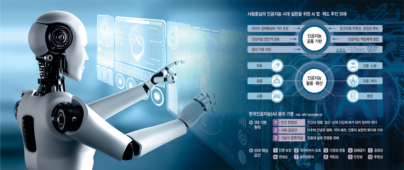 정부는 지난해 12월 말 ‘AI 법·제도·규제 로드맵’을 발표했다. 1년 가까이 민간 전문가와 관계부처 간 협의를 통해 완성한 우리만의 독자적 AI 국가전략이다. 민간자율을 중시하는 시장친화와 사회적 합의를 거친 상생·포용이란 2개의 상반된 가치를 조화시키려 애쓴 점이 특징이다. 또 AI 윤리 기준(그래픽 참조)과 의료 AI의 기초가 되는 한국형 정밀의료병원정보시스템(P-HIS)도 새로 도입해 함께 선보였다. AI 확산에 따른 혜택은 극대화하고 역기능은 최소화할 수 있도록 향후 법·제도를 정비함에 있어 △새 기술과 옛 제도의 간극을 선제적으로 극복 △글로벌 동향과 우리 실정의 조화 △사회적 합의를 통한 상생·포용 △민간자율을 우선하는 시장친화의 4대 기본 방향을 수립했다.