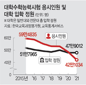 신입생 모집 난항은 입학 정원 대비 수능 응시 인원 현황에서도 여실히 드러나고 있다. 한국교육과정평가원 등에 따르면 수능 응시생은 2015학년도 59만4835명, 2019학년도 53만220명, 2020학년도 48만4737명에서 2021학년도 42만1034명으로 크게 줄었다. 덩달아 일반대와 전문대 통틀어 입학 정원도 2015년 51만7965명, 2019년 49만9565명, 2020년 47만8924명에서 2021년 47만9012명으로 감소했지만, 올해는 학령인구 감소 여파가 강하게 불면서 ‘정원 대비 신입생 자원’ 역전현상이 발생했다. 또 앞으로 4년 뒤인 2025년에는 수능 응시인원이 37만6000명으로 감소해 현재 입학정원보다 10만3000명 정도 모자랄 것으로 예측됐다. 전문가들은 입학 정원이 그대로 유지되는 상태에서 이러한 추세가 지속하면 15년 후에는 산술적으로 4년제 대학(206개)의 절반 가까이가 존폐 위기에 처하며, 그 대부분은 지방 대학이 될 것이라고 전망했다. 이에 따라 저출산·고령화와 수도권 인구 유출로 인한 지방소멸이 ‘대학 폐교’로 앞당겨진다는 진단도 나왔다. 교육부에 따르면 이미 신입생 충원 부족 등으로 지난 2000년 이후 전국에서 17개(전문대 포함) 대학이 폐교했으며 모두 지방 소재로 나타났다.
