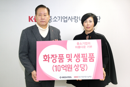 스킨 홈케어 브랜드 ‘메디필’ 운영사인 스킨이데아는 13일 중소기업사랑나눔재단에 10억 원 상당의 생필품과 화장품을 전달했다. 전복순(사진 오른쪽) 스킨이데아 대표이사는 “향후 근로 저소득계층을 위한 봉사활동에도 적극 참여해 따뜻한 나눔을 실천하겠다”고 말했다.