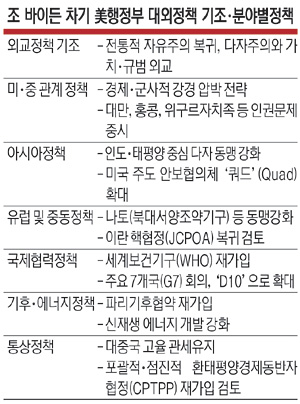 국내 전문가들은 바이든 행정부의 대외정책이 매우 실용적일 것으로 전망하고 있다. 민정훈 국립외교원 교수는 18일 문화일보와의 전화통화에서 “낙후된 공업지대인 ‘러스트벨트’의 백인 중산층이 보여준 불만을 의식해 실용 외교 정책을 추진할 것”이라고 말했다. 특히 다자주의와 가치·규범을 중시하면서 트럼프 행정부에서 약화한 국제제도·기구 재정립과 동맹·우방국과의 협력 강화를 내세울 것으로 예상된다. 파리기후변화협약과 포괄적·점진적 환태평양동반자협정(CPTPP) 재가입, 이란 핵협정(JCPOA) 복귀 등도 이뤄질 것으로 보인다.
