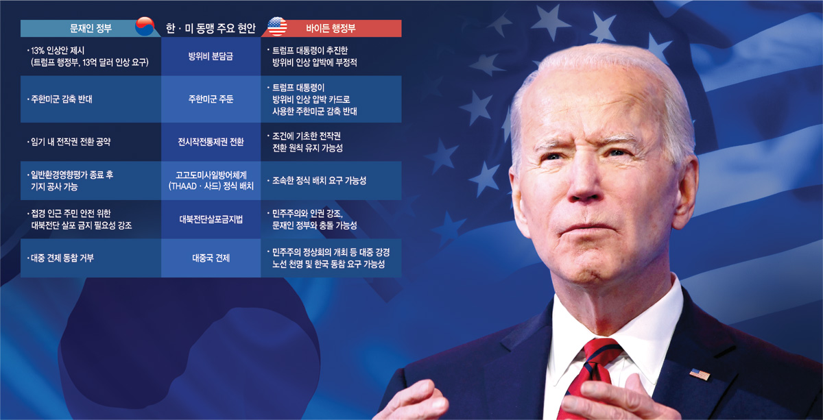 그러나 바이든 당선인이 내세운 ‘동맹’이 미국뿐 아니라 동맹의 역할도 강조하는 것이어서 중국 및 북한 눈치를 보는 문재인 정부와 파열음을 낼 가능성도 적지 않다. 바이든 당선인은 지난해 말 “동아시아와 그 이상의 지역에서 평화를 지키기 위해 우리(한·미)의 동맹을 강화하면서 한국과 함께 설 것이다”고 강조했고, 대선 승리 이후에는 대중 견제를 위해 “다른 민주주의 국가와 협력할 필요가 있다”고 말했다.