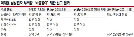 19일 이 부회장 측 변호인은 문화일보와의 통화에서 “실익을 떠나 억울한 측면을 호소한단 차원으로 재상고를 검토할 수도 있지만, 좀 더 면밀한 검토를 위해 재상고 결정까지는 시간이 걸릴 것”이라고 말했다. 서울고법 형사1부(재판장 정준영)는 전날 뇌물공여 등 혐의로 기소된 이 부회장이 박근혜 전 대통령에게 건넨 86억8000여만 원을 적극적 성격의 뇌물로 보고, 횡령 혐의까지 인정하는 등 대법원의 파기환송 취지에 따른 결론을 내렸다. 특히, 양형 기준으로 제시했던 삼성 준법감시위원회도 실효성을 이유로 양형에 참작하지 않으면서 이를 둘러싼 논란에 선을 그었다. 삼성은 일단 준법감시위는 유지시키고 활동도 지속한다는 방침이다.