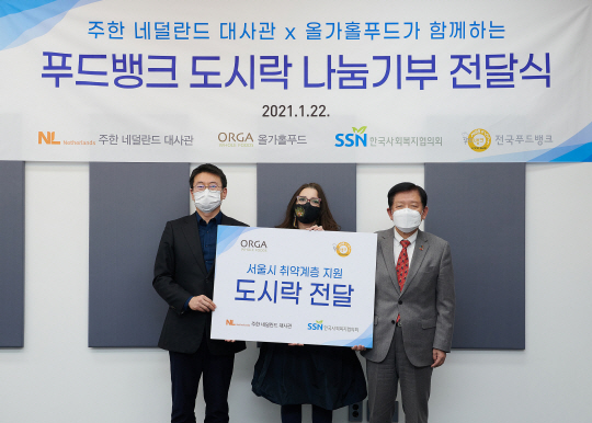 풀무원 계열사인 올가홀푸드는 지난 22일 서울 마포구 한국사회복지협의회에서 ‘올가홀푸드X주한 네덜란드대사관 도시락 나눔 기부 전달식’을 진행했다고 25일 밝혔다. 강병규(왼쪽부터) 올가홀푸드 대표, 겔라레 나더르 주한 네덜란드대사관 농무참사관, 서상목 한국사회복지협의회장이 전달식을 하고 있다.