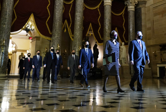 미국 하원의 탄핵 소추위원들이 25일 워싱턴DC 의회의사당에서 도널드 트럼프 전 대통령 탄핵 소추안을 상원에 전달하기 위해 팀 블로젯(맨 오른쪽) 하원 경비대장 대행의 인도를 받으며 상원으로 이동하고 있다. 이에 따라 26일부터 상원의 탄핵 소추안 심리 절차가 개시될 예정이지만, 민주·공화당 합의에 따라 실질적 심리는 오는 2월 8일 즈음 시작될 것으로 보인다.