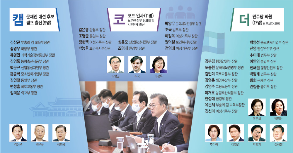 문재인 정부는 지난 3년 8개월 동안 3차례 중폭 이상 개각을 통해 15번 장관을 교체했다. ‘캠코더’(캠프·코드·더불어민주당) 출신 장관(후보자 포함) 비율은 60∼80%대로, 캠코더로 장관을 교체한 자리에 캠코더 인사를 임명하는 돌려쓰기 인사를 반복해 왔다. 특히 집권 후반기에 접어들면서 캠코더 중 친문(친문재인)계 민주당 의원 비율이 다시 높아지고 있다.