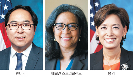 민주당의 앤디 김 의원과 스트리클런드 의원도 하원 외교위에 소속돼 있다. 지난해 11월 재선에 성공한 앤디 김 의원은 한국계 이민 2세로 뉴저지에서 학창 시절을 보내고 시카고대를 졸업했다. 로즈 장학생으로 선발돼 영국 옥스퍼드대에서 국제관계학 박사학위를 받았다. 외교·안보 전문가로 통하는 김 의원은 2009년부터 국무부에서 근무했고 2013년부터 2015년까지 국방부와 백악관 국가안보회의(NSC)에서 이라크 등 중동 담당 보좌관을 지냈다. 주한미군 출신 아버지와 한국인 어머니를 둔 스트리클런드 의원은 서울에서 태어나 한 살 때 미국으로 건너갔다. 워싱턴주 터코마 시의원을 거쳐 시장에 당선됐고 2010년부터 2018년까지 재직했다. 자신의 한국명을 ‘순자’라고 밝힌 스트리클런드 의원은 지난 3일 의회 취임식에서 한복을 입고 선서할 정도로 한국계라는 자신의 정체성을 강조해왔다.