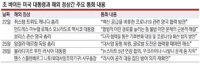 이런 가운데 바이든 대통령은 정상외교에도 시동을 걸었다. 바이든 대통령은 이날 푸틴 대통령과의 통화에서 뉴스타트 5년 연장 입장을 확인했다. 2010년 4월 미·러 양국이 체결한 뉴스타트는 실전 배치 핵탄두 수를 1550개 이하로, 이를 운반하는 대륙간탄도미사일(ICBM)·잠수함발사탄도미사일(SLBM)·전략폭격기 등의 운반체를 700기 이하로 각각 줄이는 것을 핵심으로 하고 있다. 하지만 두 정상은 다른 현안에 대해서는 상대국의 행동에 대한 우려 목소리를 내면서 기 싸움을 펼쳤다.