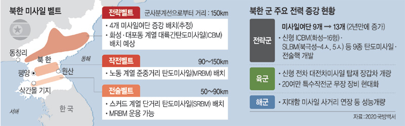 국방부가 2일 발간한 ‘2020 국방백서’에 따르면 북한군은 전략군 예하에 미사일여단을 13개로 증편했다. 현 정부 들어 처음 발간된 ‘2018 국방백서’에 명시된 미사일여단은 9개였다. 미사일여단에는 남한 전역을 타격하는 단거리탄도미사일(SRBM) 스커드(사거리 300∼1000㎞)를 비롯해 준중거리탄도미사일(MRBM) 노동미사일(1300㎞), 중거리탄도미사일(IRBM) 무수단(3000㎞ 이상) 등이 배치된 것으로 알려졌다. 미사일여단을 4개 더 늘려 북한판 이스칸데르(KN-23)와 에이태큼스(전술지대지미사일), 화성-12형 IRBM, 화성계열 일부 대륙간탄도미사일(ICBM)을 배치한 부대를 추가 편성했을 가능성이 제기된다.