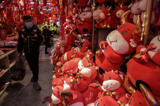1일 중국 베이징의 한 시장을 찾은 주민이 신축년(辛丑年)을 알리는 소 모형들이 가득 진열된 상점 앞을 지나가고 있다.