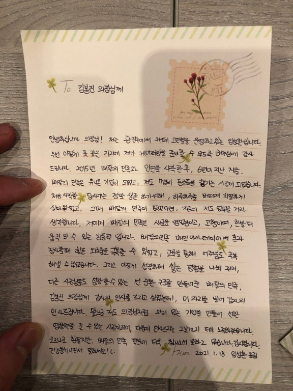 지난달 18일 김봉진 우아한형제들 의장 앞으로 한 통의 손편지가 전달됐다. 서울 광진구에서 카페 ‘고은별’을 운영하는 임성환(32) 씨가 쓴 편지(사진)였다. 그는 편지에 어려웠던 시절을 언급하며 “정말 생존하기 위해, 하루하루를 버티며 치열하게 살아왔었는데 배달의민족(배민)이 없었다면 저도 없었을 것이라고 생각한다”고 적었다. 그러면서 “홀로 장사를 할 때 느꼈던 외로움과 어려움을 배민아카데미 교육을 통해 극복할 수 있었다”며 감사함을 전했다.