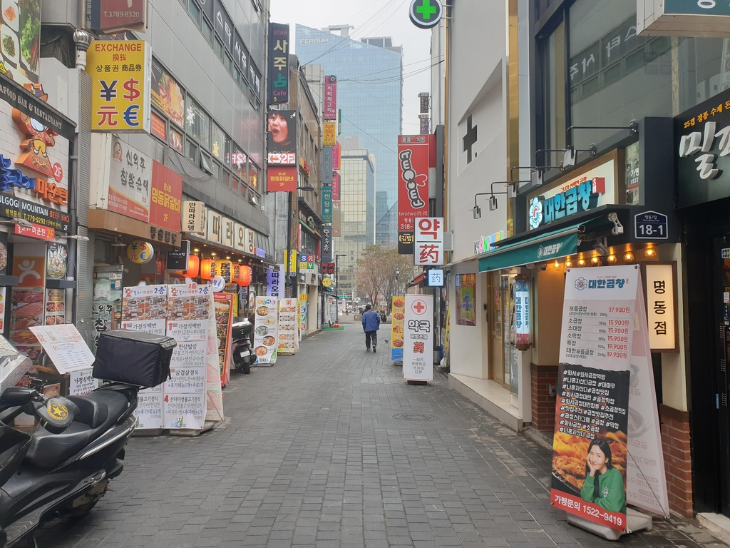 주말인 6일 서울 최대 번화가 중 하나인 명동의 음식점들은 점심시간에도 한산했다. ‘휴업’이라고 적힌 종이를 붙인 채 문을 닫은 식당도 보였다. 명동에서 일본식 선술집을 운영하는 유모(78)씨는 “가게가 총 72석인데, 지금 손님이 3명 있다”며 이 정도로는 유지도 힘들다“고 말했다.