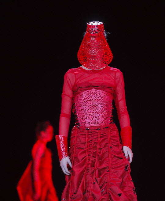 7일(현지 시간) 우크라이나 키예프에서 열린 ‘패션위크 노시즌 2021’ 행사에서 한 모델이 우크라이나 디자이너의 의상을 선보이고 있다. 신종 코로나바이러스 감염증(코로나19)으로 이번 우크라이나 패션위크는 방문객 없이 온라인으로 8일까지 진행된다.