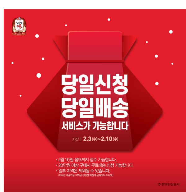 KGC인삼공사는 이와 함께 미리 설 선물을 준비하지 못한 고객을 위해 정관장 제품을 당일 주문해 당일 배송 받을 수 있는 ‘당일신청·당일배송’ 서비스도 오는 10일 정오까지 시행한다. 전국에 위치한 정관장 로드숍에 방문하거나 유선으로 배송 가능한 제품과 지역을 확인해 신청하면 실시간으로 당일 배송한다.