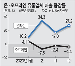 백화점·대형마트 등 오프라인 유통업계도 코로나19 영향으로 격차가 심해지고 있다. 올해 정부의 선물 가격 상한선 한시 인상으로 대형 유통업체들의 온라인 매출은 다소 늘었다. 1월 4일~2월 7일 사이 신세계백화점 설 선물세트 예약판매와 본 판매 매출은 지난해 대비 44.7% 증가했다. 현대백화점도 설 선물세트 매출이 전년 대비 48.3% 성장했다. 롯데마트는 지난해 12월 24일부터 지난 7일까지 매출이 전년 동기 대비 24.9% 증가했다. 백화점 업계 관계자는 “온라인으로 설 선물세트를 예약한 고객이 늘었다”며 “온·오프라인 매출 격차는 더욱 벌어질 것”이라고 말했다.