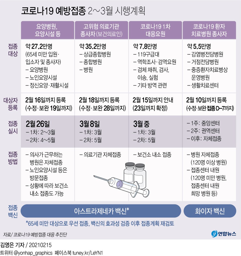 정부는 당초 1분기에 요양시설 노인·종사자 78만명을 접종하기로 했으나, 65세 이상 50만명이 대상에서 제외함에 따라 65세 미만 27만2천명이 첫 대상자가 된다.