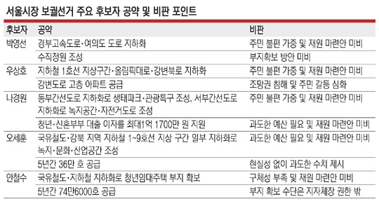 4·7 서울시장 보궐선거에 출마한 여야 예비후보들이 경부고속도로, 국철 지하화 등 재원 마련안도 없고 온갖 부작용이 예상되는 대규모 공약을 쏟아내고 있다. 이번 서울시장 선거가 ‘지하화 선거’라는 말이 나올 정도다. 특히 부동산 공급 방안으로 일제히 내건 고속도로·지하철 등 지상 구간의 ‘지하화’ 공약은 타당성이 부족해 고 박원순 전 시장 재임 당시 백지화됐던 것으로 나타났다.