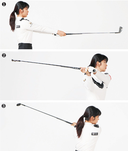 올바르게 백스윙을 했다면 사진③과 같이 폴로스루까지 스윙을 이어가야 한다. 이때의 중요 포인트 또한 클럽이 수평으로 움직여야 한다는 점이다.