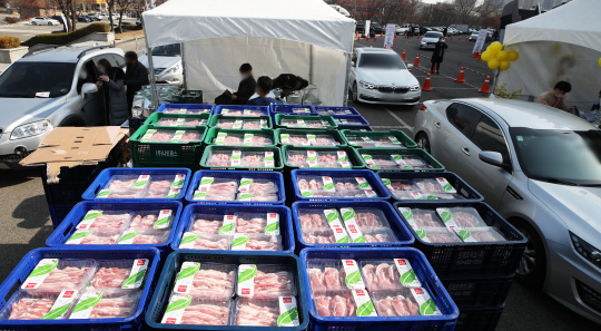 3일 오전 경기 수원종합운동장 주차장에서 열린 ‘한돈 꾸러미 드라이브스루 특별할인행사’에서 시민들이 상품을 구매하고 있다.