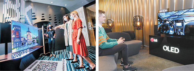 삼성전자는 싱가포르에서 ‘네오 QLED’를 비롯한 2021년 TV 신제품을 출시하고 현지 미디어 등을 대상으로 체험 행사(왼쪽 사진)를 진행했다고 25일 밝혔다. LG전자도 이날 러시아 모스크바 소재 프리미엄 게이밍 라운지 ‘인베이전 유니버스’에 올레드 TV와 울트라기어 게이밍 모니터를 공급했다고 발표했다. 모델이 VIP 전용 게이밍 공간에 조성된 체험존에서 LG 올레드 TV로 게임을 즐기고 있다(오른쪽).