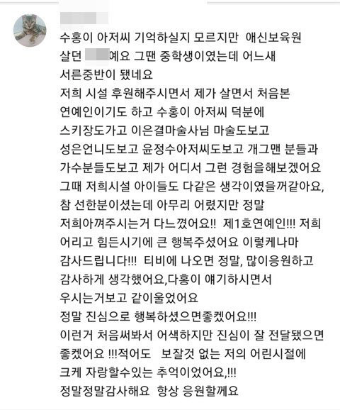 애신원에서 생활했다는 한 누리꾼은 31일 유튜브 댓글에 “(박)수홍이 아저씨가 기억하실지 모르겠지만, 그땐 중학생이었는데 어느새 서른 중반이 됐다. 저희 시설을 후원해 주시면서 제가 살면서 처음 본 연예인이기도 하다. 수홍이 아저씨 덕분에 스키장도 가 보고 이은결 마술도 보고 많은 개그맨과 가수분들도 볼 수 있었다. (수홍이 아저씨 아니면) 제가 어디서 그런 경험을 해보겠냐”며 “참 선한 분이셨는데 제가 어린 나이였음에도 저희를 아껴주시는 게 다 느껴졌다. 제1호 연예인. 어리고 힘든 시기에 큰 행복을 주셨다. 이렇게나마 감사의 인사를 전한다. 이젠 정말 진심으로 행복하셨으면 좋겠다”라고 글을 남겼다.