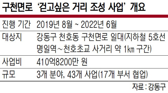 2일 강동구에 따르면, 구는 지난해 초 구천면로의 문제점을 인식하고 이정훈 구청장을 포함해 12명의 위원이 참여하는 ‘경관사업추진협의체’를 구성했다. 이후 구천면로와 접한 천호1동과 암사1동에서 사업 설명회를 열어 수렴한 주민 의견을 바탕으로 지난해 8월 ‘걷고 싶은 거리 조성 사업 추진계획’을 수립했다. 내년 6월까지 410억8200만 원의 예산이 투입되는 대형 프로젝트로, 3개 분야 43개 세부 사업이 펼쳐진다.