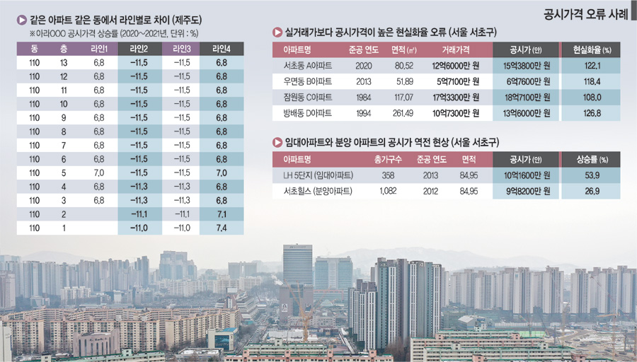 공시가격이 거래가보다 더 높은 사례 역시 황당하다는 지적이다. 서초구는 관내 공동주택 12만5294가구 중 지난해 거래가 있었던 4000여 가구 기준으로 검증한 결과, 136가구(3%)가 실거래가보다 공시가격이 더 높게 산정됐다고 밝혔다. 실거래가 대비 공시가격 현실화율 90% 이상이 208가구로 약 5%를 차지했다. 이를 12만 가구로 적용해보면 6000가구 이상에서 90% 이상의 현실화율이 이뤄졌다고 추정했다. 85%의 현실화율이 이뤄진 가구는 1만1000가구로 추정했다. 공시가격 상승률이 평균 3배를 넘는 곳도 있었다. 같은 단지 내 아파트에서도 공시가격이 어떤 동은 30% 상승, 어떤 동은 0%인 경우가 나타나 공시가격의 공정성을 의심하게 하는 사례도 발견됐다. 심지어 같은 아파트 같은 동에서도 2호 라인은 모든 층의 공시가격이 11.0∼11.5% 내린 반면, 4호 라인은 모든 층에서 6.8∼7.4% 올랐다. 층별 오름폭도 들쑥날쑥했다.