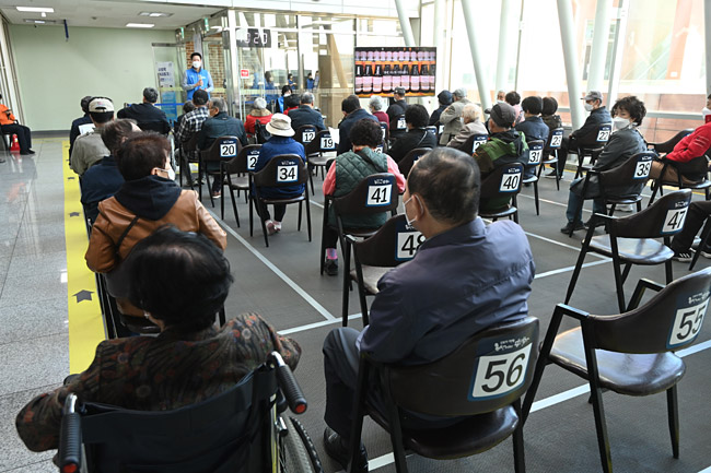 지난 1일부터 만 75세 이상 고령층에 대한 신종 코로나바이러스 감염증(코로나19) 백신 접종이 시작된 가운데 5일 서울 성북구청에 마련된 예방접종센터에서 노인들이 접종 순번을 기다리며 앉아 있다.