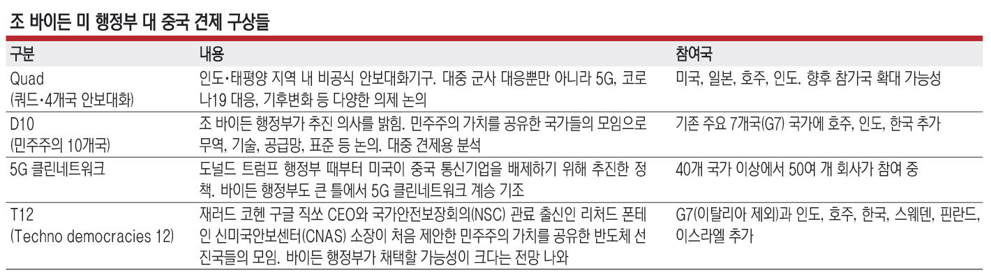 조 바이든 행정부가 5세대(G), 인공지능(AI) 등 첨단 테크놀로지 분야에서 중국 견제를 위한 주요 틀로 민주주의 가치를 공유한 반도체 선진국들의 모임인 T12(Techno democracies 12)를 추진할 가능성이 큰 것으로 알려졌다. 대중 견제 성격의 안보협의체인 쿼드(Quad) 확대 참여를 꺼리는 문재인 정부가 미국이 T12 참여를 요청한다면 응할지 여부에 관심이 집중된다. 이 가운데 5G, AI, 집적회로 등 전방위적인 신산업 분야에서 협력하자는 중국의 요구도 거세지고 있다. 한·미 외교안보 전문가들 사이에서는 문 정부가 중국의 눈치를 보느라 세계 각국이 새로운 테크놀로지 기술 표준을 만들기 위해 머리를 맞대는 ‘룰 메이킹(rule making)’ 국면에서 외톨이 신세로 전락하고 있다는 지적이 나온다.