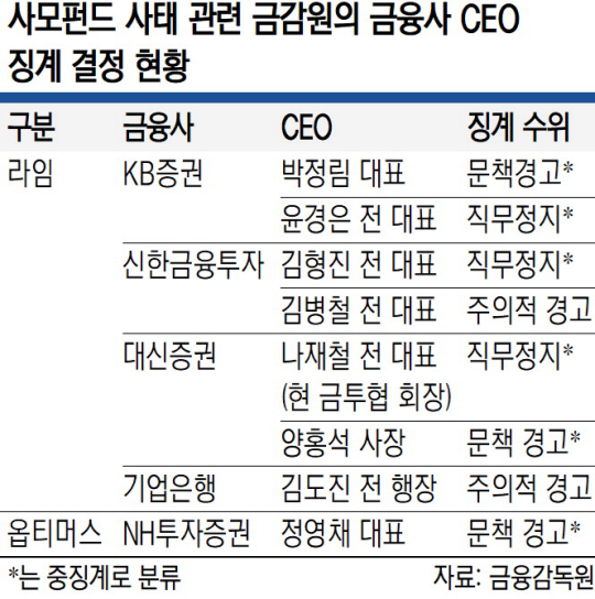 앞서 금감원은 제재심에서 라임펀드 사태와 관련해 박정림 KB증권 대표이사와 양홍석 대신증권 사장에게 중징계인 문책 경고를 결정했다. 특히 중징계 결정이 뒤늦게 알려진 양 사장의 경우 경영을 이끄는 대표가 아닌 등기 임원(대주주)이어서 징계 적절성 논란이 일고 있다. 금융사 임원에 대한 제재는 ‘해임 권고-직무 정지-문책 경고-주의적 경고-주의’ 등 5단계로 나뉘는데 문책 경고 이상은 연임 및 3∼5년간 금융권 취업이 제한된다.
