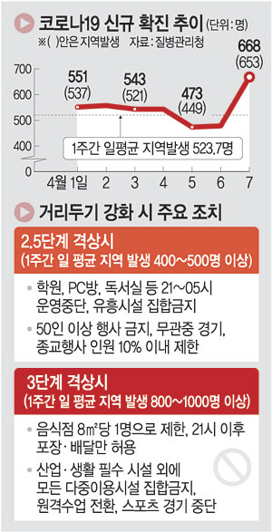 7일 중앙방역대책본부에 따르면 이날 0시 기준 일일 확진자 668명을 기록함에 따라 최근 일주일간 하루 평균 544.7명꼴로 확진자가 나왔다. 거리두기 단계 조정의 핵심 지표인 일평균 지역발생 확진자는 523.7명으로, 2.5단계(전국 400∼500명 이상 등) 기준을 이틀 연속 넘어섰다. 전날에도 일평균 지역발생 확진자는 500.6명으로 80일 만에 500명을 넘어선 바 있다.