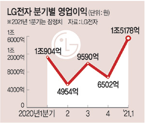 사업부별로 보면 생활가전을 담당하는 홈어플라이언스앤에어솔루션(H&A) 사업본부는 올해 1분기 9000억 원 안팎의 영업이익을 거둔 것으로 추정된다. 스팀가전을 포함한 신(新)가전과 공간 인테리어 가전 브랜드 ‘LG오브제컬렉션’ 등 프리미엄 제품들이 글로벌 시장에서 지속적인 판매 호조를 보인 점이 실적 상승세를 견인한 것으로 분석됐다.
