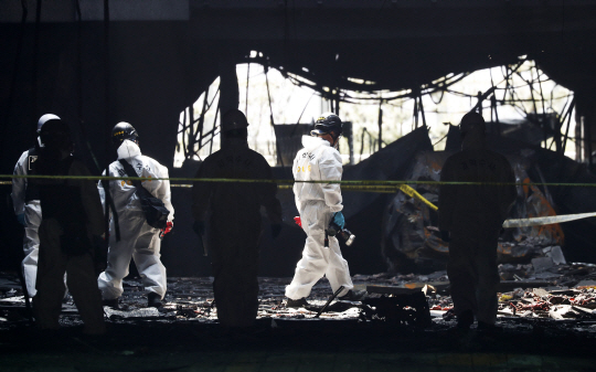 경찰 과학수사대(KCSI) 화재감식반 요원들이 11일 경기 남양주시 다산동 주상복합 아파트 화재 현장에서 발화지점을 찾고 있다. 10일 오후 5시쯤 발생한 화재는 커다란 인명피해 없이 10시간 만에 진화됐지만 지하에 대형마트가 들어서 있어 대피 과정에서 혼란이 빚어졌다.