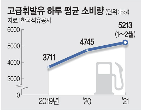 12일 한국석유공사에 따르면 지난 1∼2월 고급 휘발유의 하루 평균 소비량은 5213배럴로, 지난 2019년과 견줘 40.4% 증가했다. 지난해와 비교해도 10%가량 늘었다. 올해 같은 기간 보통 휘발유 소비량이 2019년에 비해 6% 이상 감소한 것과 비교하면 성장세가 뚜렷함을 알 수 있다. 고급 휘발유는 옥탄가(octane rating)가 높아, 엔진 출력 저하와 이상 연소를 일으키는 ‘노킹 현상’을 막아준다.