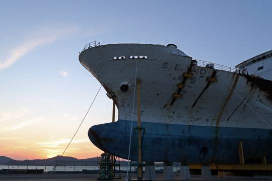 전남 목포시 목포신항에 인양 보존된 세월호 선체 너머로 14일 오후 해가 저물고 있다. 아직도 책임을 놓고 사회·정치적 공방이 끊이지 않는 가운데 세월호 참사 7주기인 16일 오후 4시 16분부터 1분간 경기 안산시 단원구 일대에는 희생자를 추모하는 사이렌이 울려 퍼진다.
