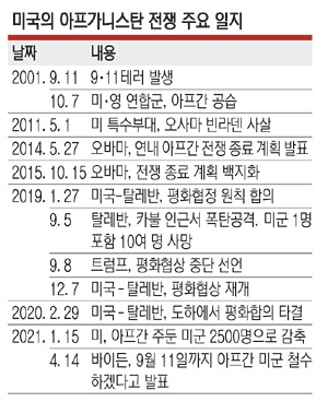 조 바이든 미 대통령은 14일 백악관에서 “아프간 주둔 미군 철수를 다음 달 1일 시작해 9월 11일 이전에 끝내겠다”면서 “미국의 가장 긴 전쟁을 끝내야 할 때며, 이제 미군이 집으로 돌아와야 할 시간”이라고 말했다. 나토 30개 회원국도 이날 성명을 내고 “5월 1일부터 나토의 아프간 지원 임무 병력 철수를 시작하기로 결정했다”고 밝혔다. 현재 아프간에는 미군 2500명, 나토 연합군 7000명이 주둔해 있다.