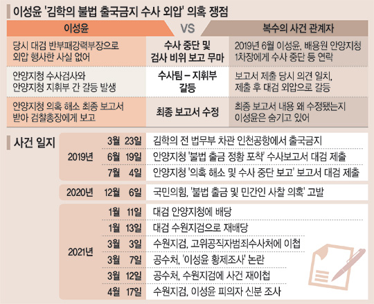 ‘김학의 전 법무부 차관 불법 출국금지 수사 외압 의혹’을 수사 중인 검찰은 2년 전 대검찰청 반부패강력부장이던 이성윤 서울중앙지검장이 안양지청 지휘부에 ‘검사 비위 보고를 수원고검에 하지 말아 달라’는 취지로 외압을 행사한 정황을 포착하고 수사를 해온 것으로 파악됐다. 아울러 검찰은 당시 대검 반부패강력부 소속 검사가 이현철(당시 안양지청장) 서울고검 검사에게 부당한 압력을 행사한 구체적 정황과 진술을 확보한 것으로 전해졌다.